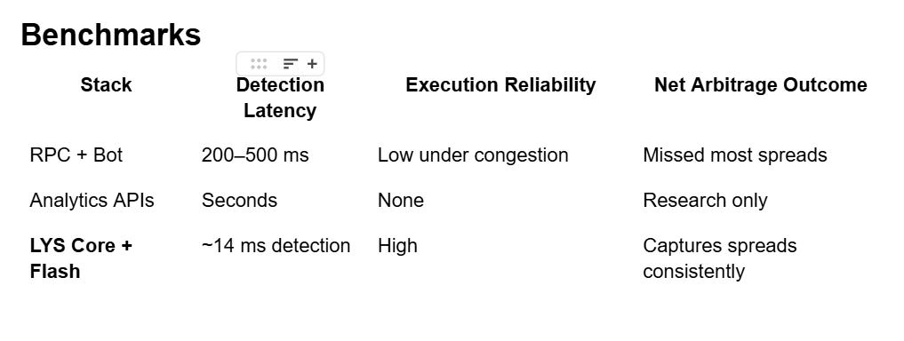 By combining Core and Flash, LYS closes the loop: signals at block speed, settlement in milliseconds. That’s the foundation of an alpha engine.